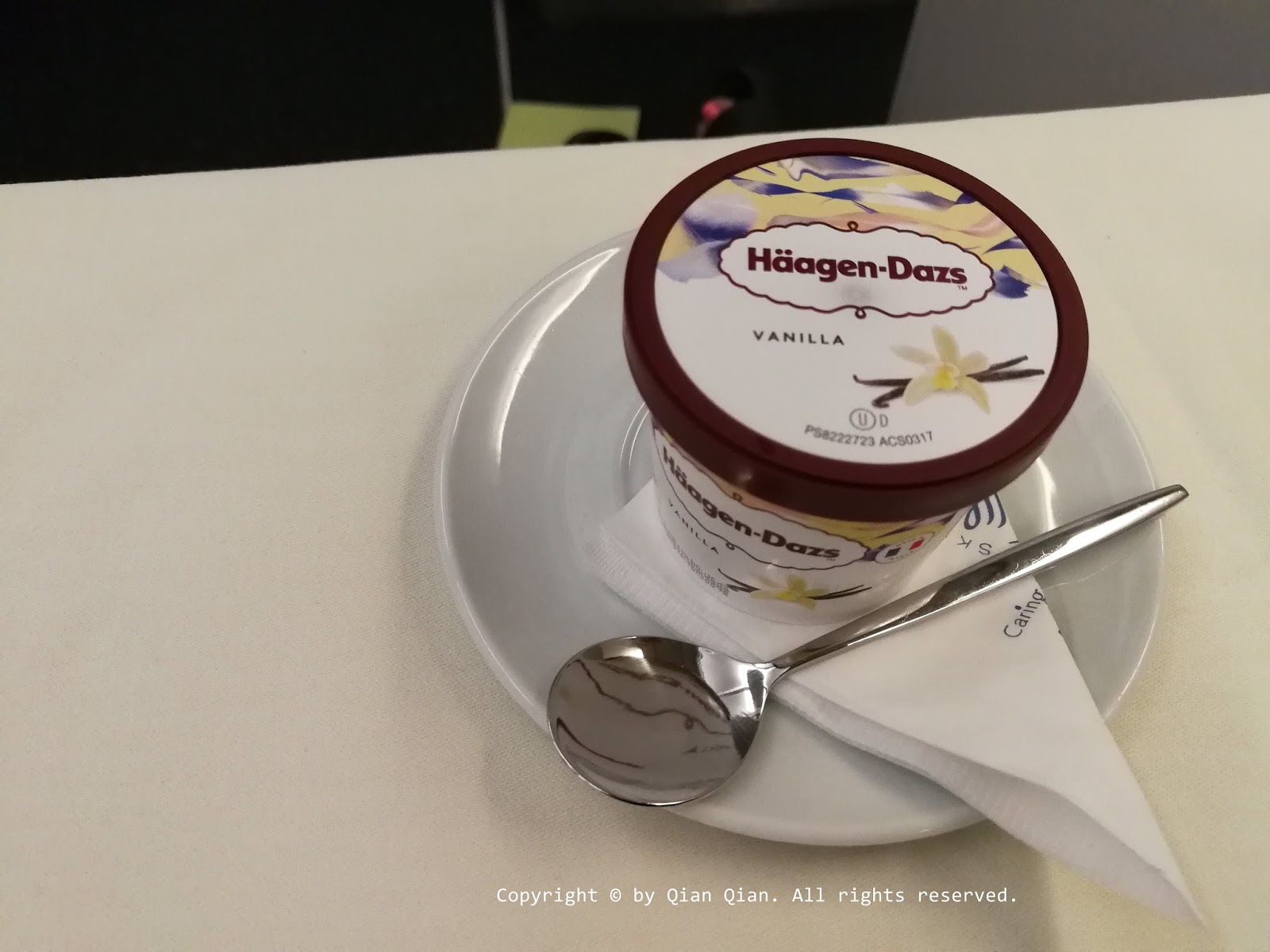最后的甜点有冰淇淋或是水果。忘了说前面的飞机餐后的甜点都是水果,饮料也有酒或果汁等。鸟神之所以会吐是因为他的胃很酸。飞机舱的欢迎饮料我都选果汁,可是果汁却很酸。最后鸟神帮我喝,当天上飞机,他已经喝了4杯酸酸的果汁,所以才会要吐。